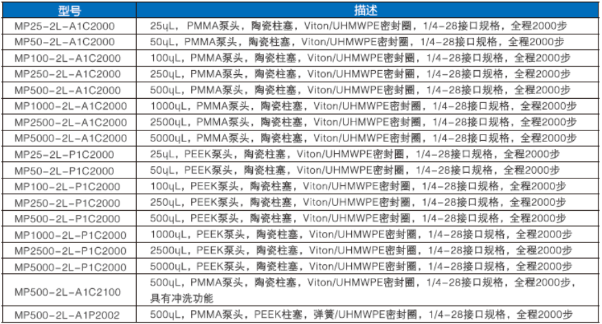 提供多種泵頭材質(PMMA/PEEK/PEI及其它)、多種柱塞材質(陶瓷/PEEK及其它),多種密封圈材質(UHMWPE/Viton/FFKM/302ss及其它)。針對不同屬性的溶液選擇適合的材質,可延長泵的使用壽命,降低設備維護成本。