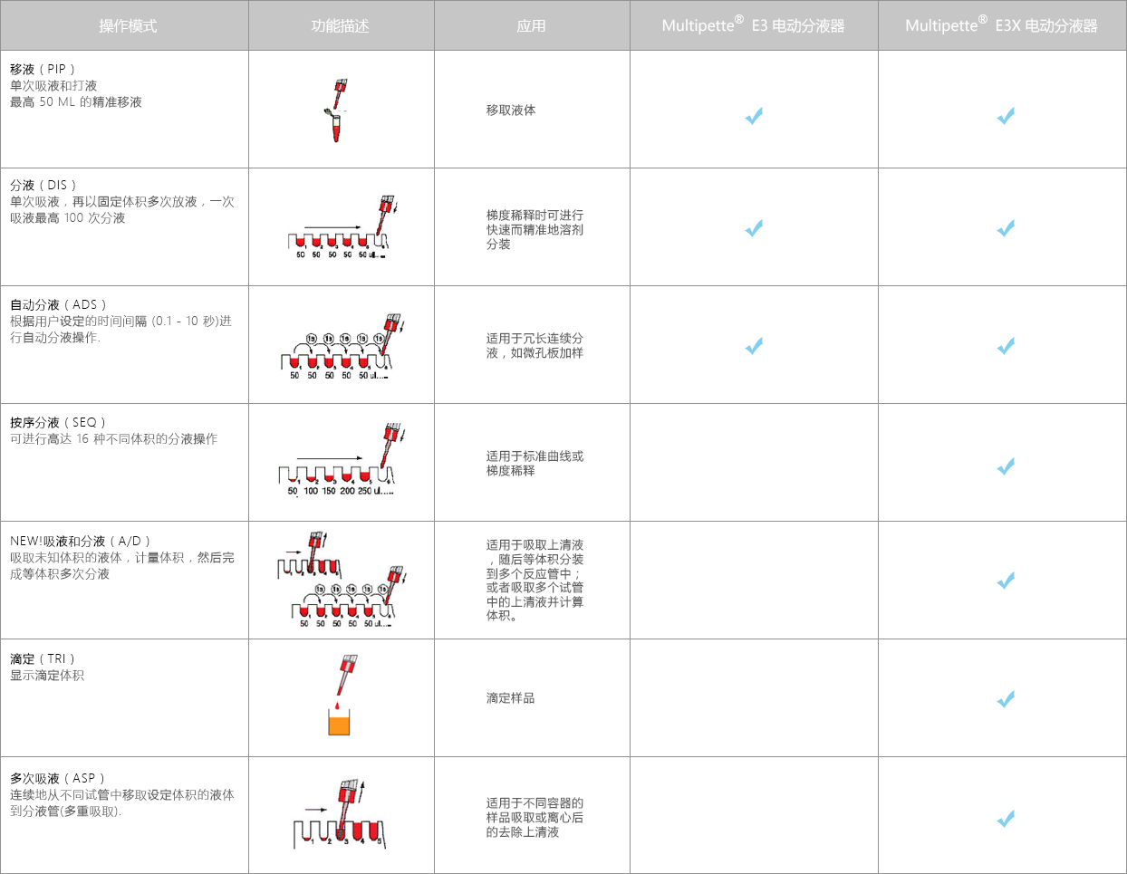 Multipette® E3/E3x 電動分液器結合 9 種不同規(guī)格 Combitips advanced® 分液管,提供從 1 μL——50 mL 的分液范圍,超過 5000 種分液體積,一次吸液可完成最高 100 次分液