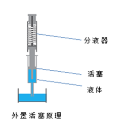 分液器結合分液管,采用外置活塞原理。分液管內自帶有活塞,通過活塞的連接運動移取和打出液體(類似注射器)。