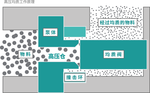 物料由物料杯經(jīng)單向閥進(jìn)入高壓倉,通過泵體伸縮加壓使樣品達(dá)到所調(diào)節(jié)控制的高壓下,通過特定寬度的限流縫隙瞬間釋放形成微射流撞擊沖擊閥或均質(zhì)閥上,依次經(jīng)過空穴、撞擊、剪切的作用來達(dá)到物料的乳化分散和細(xì)胞粉碎機(jī)的目的。