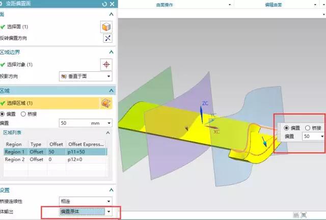 然后再區(qū)域列表中選擇需要偏執(zhí)的面,輸入偏執(zhí)距離,可輸入正負,或者直接點擊黃色面上的箭頭直接輸入,體輸出選擇偏執(zhí)原體。