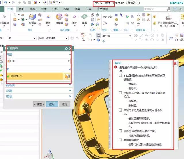 很多朋友都在修模的時候遇到過這樣的問題,就是當你使用同步建模的時候,用刪除面的時候,選擇一個面刪除,會出現(xiàn)報警。這個是因為你選擇要刪除的面與其他面之間存在一定的關聯(lián),你刪除這個面后無法計算,所有就會出現(xiàn)報警的情況。