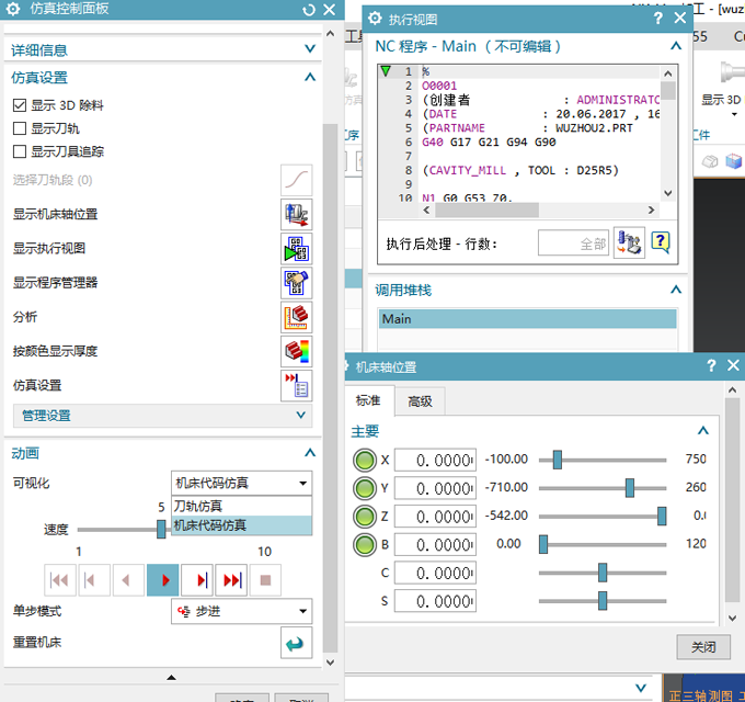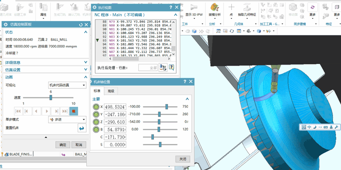 下圖可見界面非常清楚的表示出你想要的所有信息,包含各個軸的運行狀態(tài),當前運行的G代碼和行數,并可實時顯示3D除料狀態(tài),了解切削狀態(tài)。同時還可以顯示切削時間,使用刀具,主軸轉速,切削進給速度等信息,并在仿真結束后查看殘留厚度等!?。?!