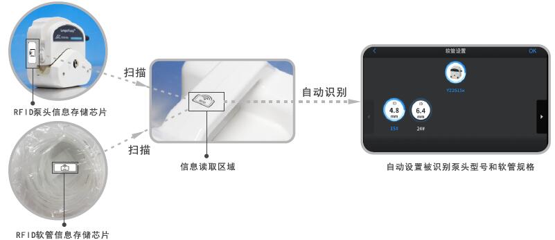新推出的三款智能蠕動泵具有“泵頭和軟管型號自動識別”功能。通過RFID技術,泵可自動讀取泵頭型號和軟管規(guī)格信息,并在運行方案中設置相應參數(shù)。不僅幫助客戶簡化操作過程,提高工作效率,而且能夠有效保證泵頭與軟管參數(shù)的正確性,為實現(xiàn)高精度的流體傳輸提供有力支持。