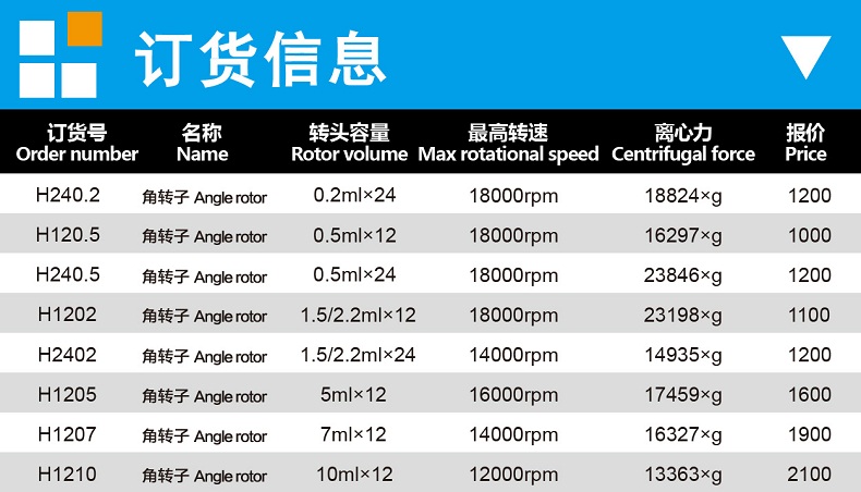 | H120.5 | 角轉(zhuǎn)子 | 0.5ml*12 | 18000rpm | 16297*g |