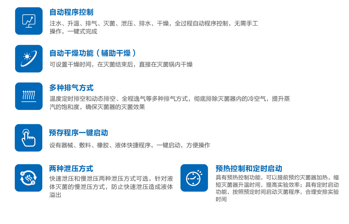 產(chǎn)品以高溫飽和水蒸氣為滅菌介質(zhì)的立式全自動快速滅菌設(shè)備。適用于化驗室、實驗室、手術(shù)室、供應(yīng)室、高等教育、畜牧業(yè)、疾控等各級醫(yī)療衛(wèi)生和生物醫(yī)學(xué)科研單位,對器械、敷料、橡膠、液體、玻璃器皿、培養(yǎng)基、廢棄物等物品的快速滅菌。