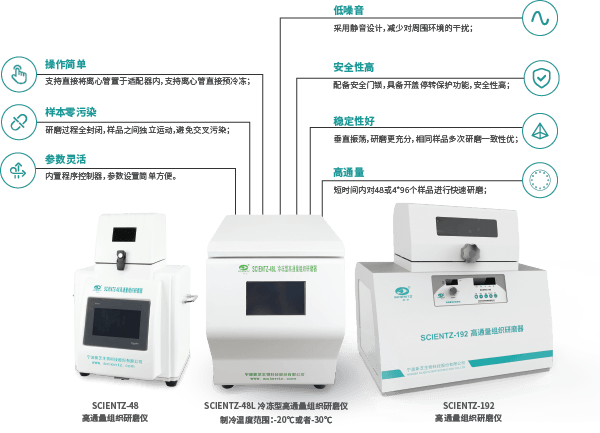 SCIENTZ-192高通量組織研磨器也同樣采用高頻垂直振蕩的方式,用戶可以選擇不同的研磨珠對不同性狀的樣品在離心管內(nèi)直接對樣品進(jìn)行研磨,研磨管內(nèi)樣品與研磨球相互碰撞,其產(chǎn)生的研磨剪切力和撞擊力使組織完全破碎,從而有效分離提取原始DNA、RNA。