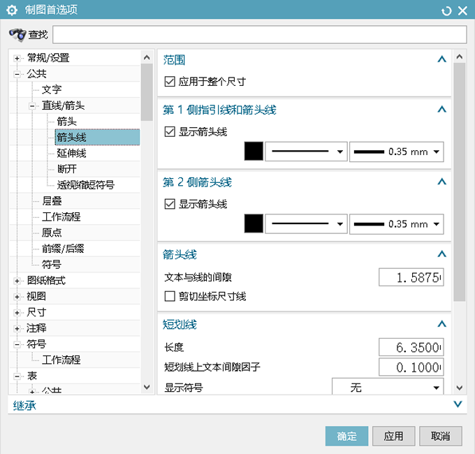 1、點(diǎn)擊:菜單→首選項(xiàng)→制圖,然后選擇:公共→直線/箭頭→箭頭線。