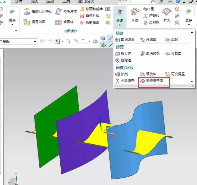 在曲面操作中點擊選項【更多】下拉菜單,找到【變距偏執(zhí)面】