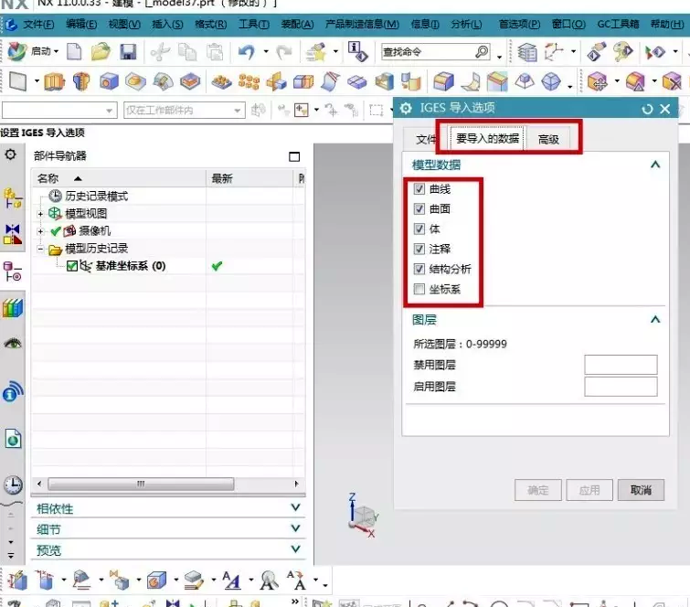 IGES格式:在要導(dǎo)入數(shù)據(jù)及高級(jí)設(shè)置欄,關(guān)閉不必要的導(dǎo)入選項(xiàng)(如:結(jié)果分析、光順B面等,根據(jù)需要進(jìn)行關(guān)閉)