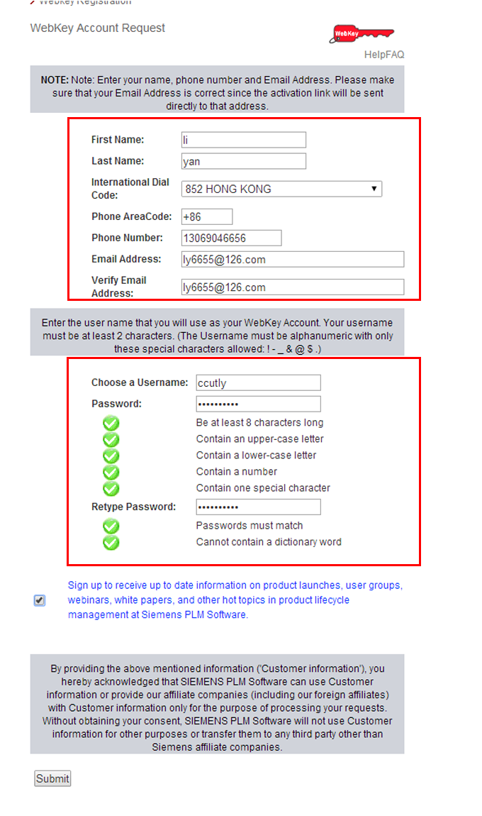這里需要注意的是賬戶名就是以后您登陸使用的名字,密碼的要求是要有大小寫、特殊字符、數(shù)字字符和8位以上的字符。填寫好了,點擊submit遞交。