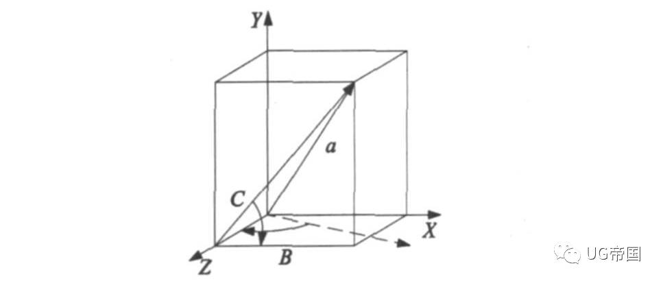 對(duì)于 B、C 旋轉(zhuǎn)軸的數(shù)控機(jī)床來(lái)說(shuō), 要想將向量 a 旋轉(zhuǎn)到與 Z 軸重合, 首先應(yīng)將向量 a繞 Z 軸旋轉(zhuǎn) C 角, 再繞 Y 軸旋轉(zhuǎn) B 角。觀察圖 1, B 角的計(jì)算公式為: