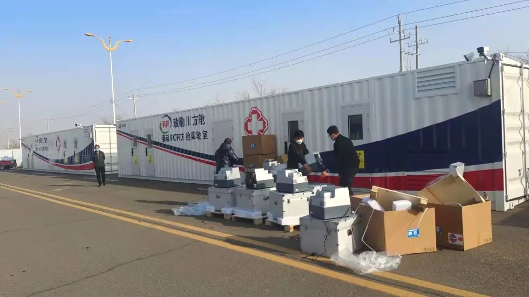 方艙的安裝一直持續(xù)到27日的深夜,我們的工作人員也片刻不離地在旁邊待命,以應(yīng)對(duì)可能出現(xiàn)的各種突發(fā)情況。幸而,功夫不負(fù)有心人,在廠家工程師、各方相關(guān)工作人員的協(xié)同努力下,2座海爾核酸檢測(cè)移動(dòng)PCR方艙于凌晨正式落成,隨后相關(guān)檢測(cè)調(diào)試流程也都在天亮前如期結(jié)束。